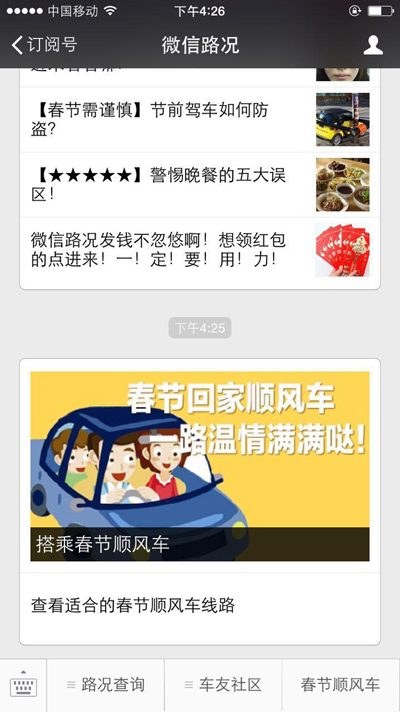 关注【微信路况】公众号(weixinlukuang),到公众号的右下角菜单“春节顺风车”,现在即可开始拼车!