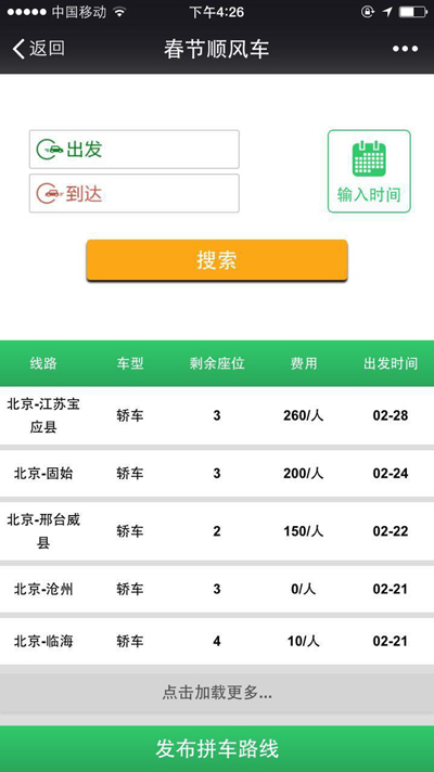 据微信第一大公众号“微信路况”发布的调研报告显示,超过六成的网友考虑今年春节期间将开车回家,而逾八成的自驾者需要实时路况服务。为了给用户提供更加方便的服务,微信路况于近日上线了“春节顺风车”的服务功能,为自驾回家的车主和买不到车票的“同路人”搭建回家过年的绿色通道。微信路况可以帮助双方智能匹配路线,推荐拼车和拼友信息。车主只需通过填写回家及返程的时间、行驶路线、价格等信息,就可发布路线信息。乘客只需搜索拼车路线,输入起始地及终点,微信路况将通过算法,智能推送匹配的拼车路线。