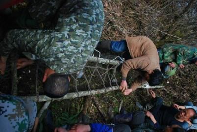 抬受伤驴友下山,山路湿滑,行动艰难。