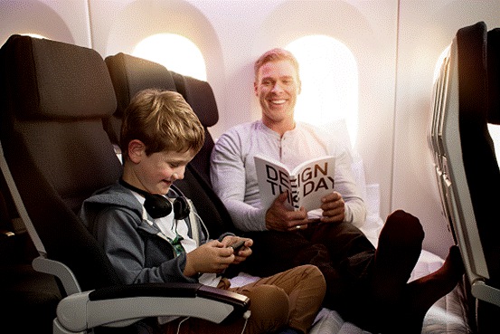 新西兰航空的“空中沙发”(Economy Skycouch™)是指同一排相邻的三个座椅能轻松转换成拥有平坦表面的沙发,可供情侣和家庭乘客在长途飞行中尽情地休息和放松。在这个独立的空间里,可以和伴侣相依相偎享受私人时光,或又悠闲地躺着看电影、打游戏;也能和知己盘腿而坐,谈天说地;甚至这能化身三万英尺高空上属于孩子们的迷你游乐场。