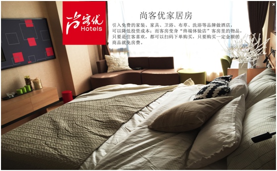 尚客优成为国内试水免费模式的酒店业先行者,其正在打造一个生活分享平台,从顾客进入尚客优酒店大堂、客房开始,酒店大堂的沙发、灯具、各种装饰,客房的床垫、靠枕、 床单、小摆件、毛巾、浴巾、洗浴用品、水杯、家具甚至壁纸,只要是顾客体验后喜欢的,都可以通过用手机扫描二维码下单购买。顾客只要购买同等房价的物品,就免房费。