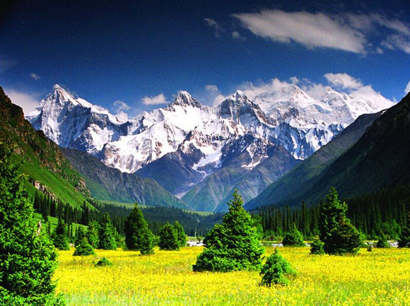历史悠久的昭苏,也是“塞外江南”美色最佳浓缩地之一,自然风光极为独特。在昭苏,一日之内可以感受春夏秋冬。这里有号称“天山之父”的汗腾格里峰直入云霄,这里峰峦如聚,雪山连绵;这里有鬼斧神工之作——木扎尔特冰川险峻雄伟、撼心动魂;有幽静神秘的夏塔大峡谷,让人回归自然,流连忘返;还有广袤无边的昭苏大草原,绿草如茵,毡房点点;这里是油菜花田的海洋,每年到了7月前后,百万亩油菜花海“从身边连到山边、从山边连到天边”,金色如织,飘香四溢,蜂飞蝶舞,大片的金黄犹如一条条金色的织毯席卷着广袤无垠的昭苏大草原,映照千年的雪山;这里有“腾昆仑,历西极”的天马。