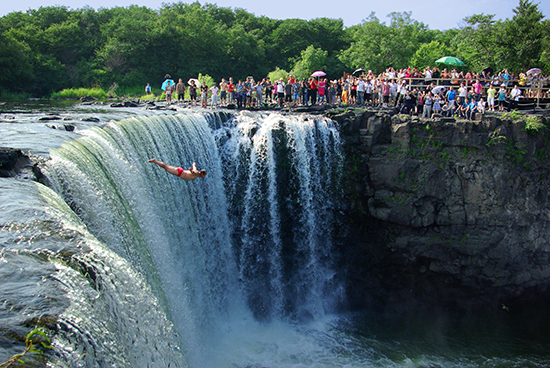 我国最大的熔岩气洞塌陷型瀑布、镜泊湖八大胜景之首—吊水楼瀑布,亦是颇为壮观,水声如雷,激流呼啸飞泻,水石相击,白流滔滔,水雾蒸腾出缤纷的彩虹。镜泊湖这一动一静,流连忘返已不足以形容游人的心境。一万年前火山喷发遗迹:万年石海、河谷、瀑布,黑龙潭、黑石壁、观瀑亭等都不容错过,下午14点,中国跳水第一人狄焕然瀑布跳水表演上演,让我真正感受了一把什么叫速度与激情。老一辈无主阶级家邓小平的题词“镜泊胜景”苍劲雄浑,游客纷纷合影留念。移步到相邻的红罗女广场观看、参与“红罗女抛绣球”表演赶脚也相当不错。后经少奇小路漫步回驻地,散步于夕阳下山庄湖畔,感受温润潮湿的气息,体验身心愉悦的出游惬意。