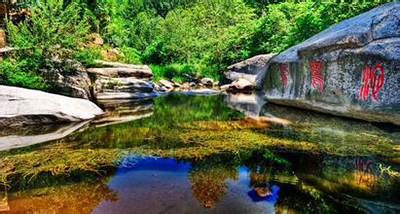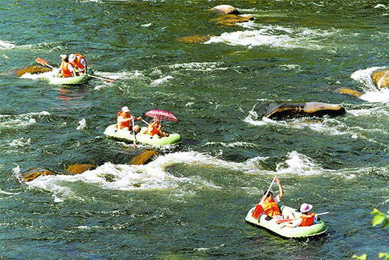 红箭门、迎宾鼓楼、朝鲜民俗村、红霞石潭、老河谷寒索、急流、神龟入水等主要景观意义走过之后,我们全家迎来了戏水环节。既然是盛夏避暑,那戏水项目必须得上,况且老公和女儿天生就这么爱玩水。从峡谷第一漂入口下水,一路漂流而下,全程3.5公里,或激流颠簸或平缓游度,历时2小时的漂流途中,有惊无险,沿途更有怪石嶙峋,清清溪水,石来运转等景色相伴,实在是太惬意了。两岸青山笼罩,十里烟波飘渺,急流惊险处挑战人们的智慧和勇气,让您尽情挥洒人生豪情,平缓静稳处,尽享大自然的静谧与温馨,让您的暇思在时空内任意飞转。尽管打湿了衣裤,疯狂的一家人似乎还有点意犹未尽。