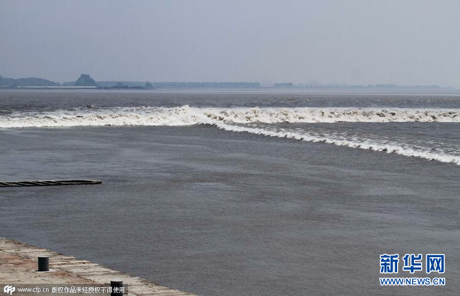 2015年08月02日,浙江海宁,钱塘江东潮和南潮出现在江面上,形成人字交叉潮。海宁丁桥新仓段钱塘江,地面拍下交叉瞬间。图片来源:cfp