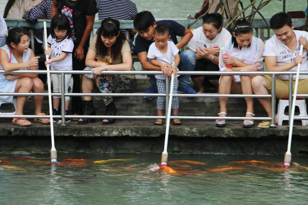 参与奶瓶喂鱼的多是家长带着孩子的亲子游客。