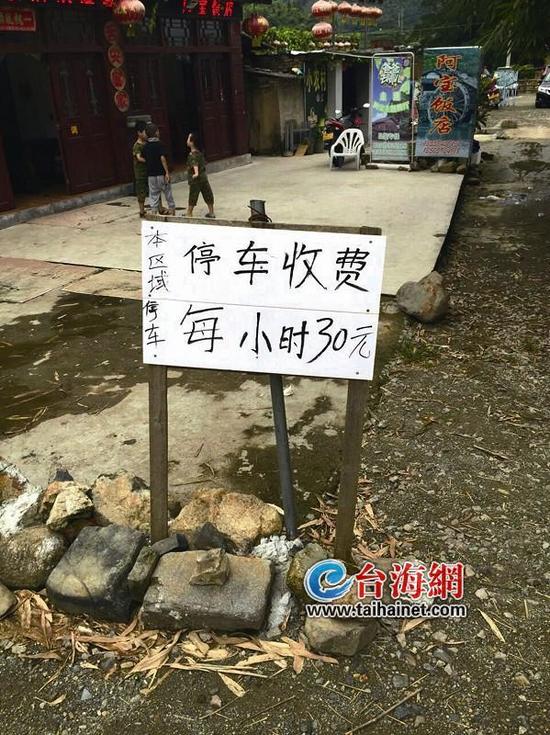 据附近一位店家介绍,该牌子已立了一段时间,立牌的店家看到外地车牌的车要停车,就跑来收费,不给钱不让走,大大影响了云水谣景区的文明形象。
