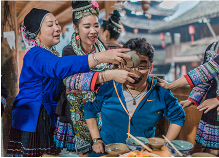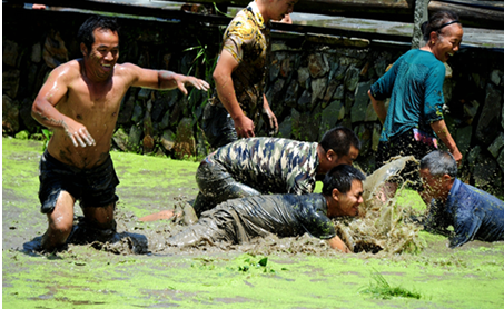 收获的金秋十月,水稻成熟却还未收割时,层层叠叠的金黄,在秋风的微拂中翻滚着浪花,空气中都洋溢着丰收的喜悦;山间枝头的果实沉甸甸地,直坠入人心中,满溢着甘甜;秋天到,鱼儿肥,满身泥泞抢鱼塘,鱼儿鱼儿哪里跑;吹起芦笙,穿戴上漂亮的节庆服饰,这个“饭养身,歌养心”的民族,用特有的原生态歌舞表达丰收的喜悦;远道而来的客人,长长的合拢宴代表侗家的盛情,一根筷子的油茶代表侗家的专情;秋风起,秋叶红,喝下寨子自酿的米酒,共赴这一场“醉”美丰收季!