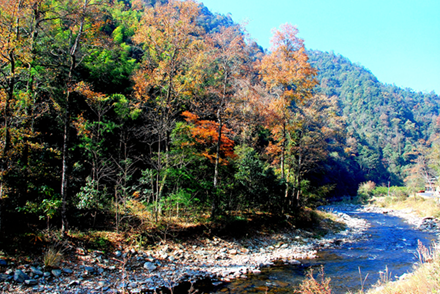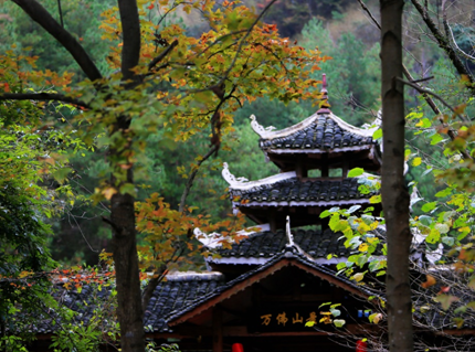 被金秋染色的万佛群峰是很美的,山林色彩层次分明。168平方公里的峰林,被点染上了十几种绚丽的色彩,有深红、浅黄、深绿……秋风吹过,密林中的枫树、桦树、白豆杉、红花木莲、银杏等渐次经霜,树叶被染成绮丽的鲜红色和金黄色,蓝天白云、丹红群峰、悬空栈道,共同勾勒出一幅醉人画卷。