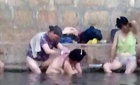 从照片上看,这位洗头的大妈穿着内衣,肆无忌惮地用洗发水洗头,周边的人都视而不见,也没有人劝阻,更没有人制止。