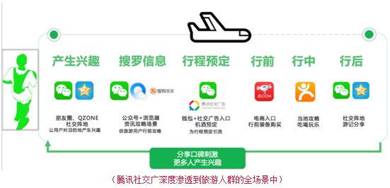 社交平台天然适合旅行者分享资讯、晒出旅游体验,旅行人群深度活跃在社交平台,形成一个天然与旅游行业相匹配的环境。QQ、微信作为已经覆盖90%中国网民的两大社交平台,占据中国移动网民55%+的上网时间,深度渗透旅游人群“产生兴趣-搜罗信息-行程预定-行前-行中-行后”的全场景中。