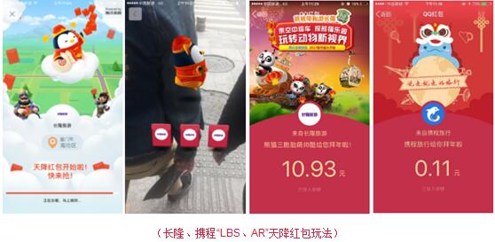 手Q红包有“LBS+AR天降红包”“刷一刷红包”“除夕红包”三种玩法。其中,“LBS+AR天降红包”在互动形式和玩法上独具创新。