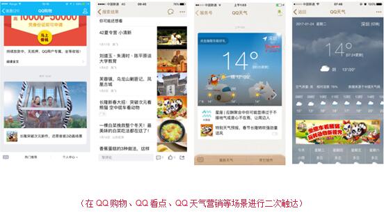 为了进一步促成效果转化,手Q还对红包覆盖相同用户人群进行了二次触达,在QQ天气、QQ看点、购物号等广告位进行信息推荐。