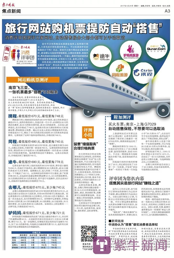 扬子晚报焦点新闻上刊登的OTA网站“搭售现象”。