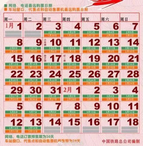 日前,中国铁路总公司通过其官方微博发布了“2018年铁路春运购票日历”。根据这份日历,2018年春运,网络、电话订票预售期为30天,车站窗口、代售点和自动售票机预售期为28天。