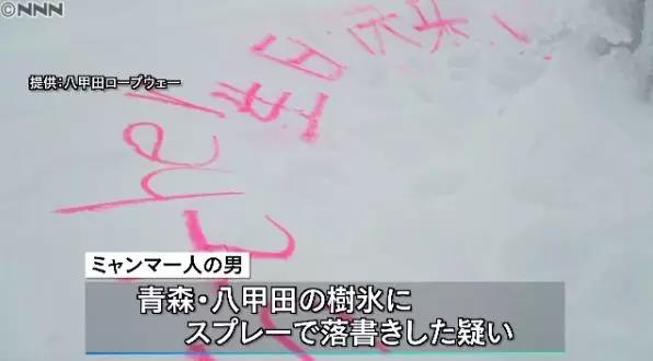 1月,日本青森县八甲田山上的知名景观“树冰”遭到游客用粉色荧光喷漆涂鸦,现场留下了用英文和中文喷写的“生日快乐”。22日,日本警察以“威力业务妨害罪”逮捕了一名在东京居住的29岁缅甸男子。该男子承认,因为想给女朋友一个惊喜才这样做的。此前,曾有不明真相的网友把矛头指向“中国情侣”。