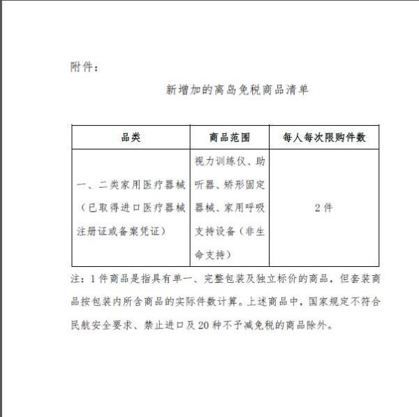 二、增加部分家用医疗器械商品,在离岛免税商品清单中增加视力训练仪、助听器、矫形固定器械、家用呼吸支持设备(非生命支持),每人每次限购2件(详见附件)。
