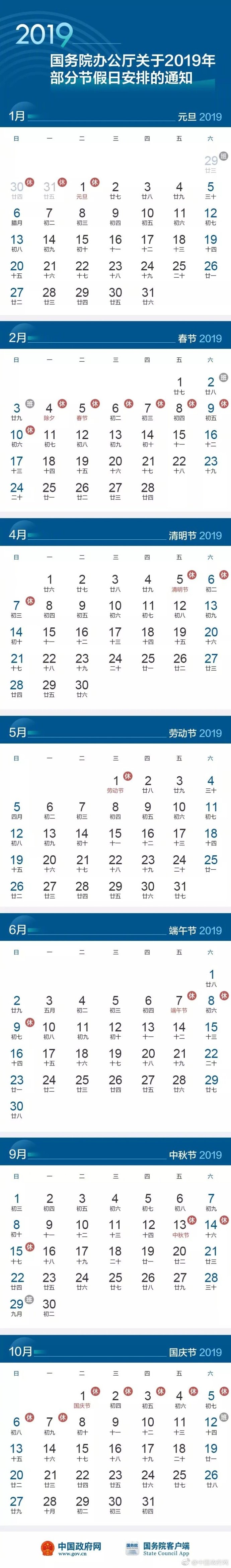 国务院办公厅关于2019年部分节假日安排的通知