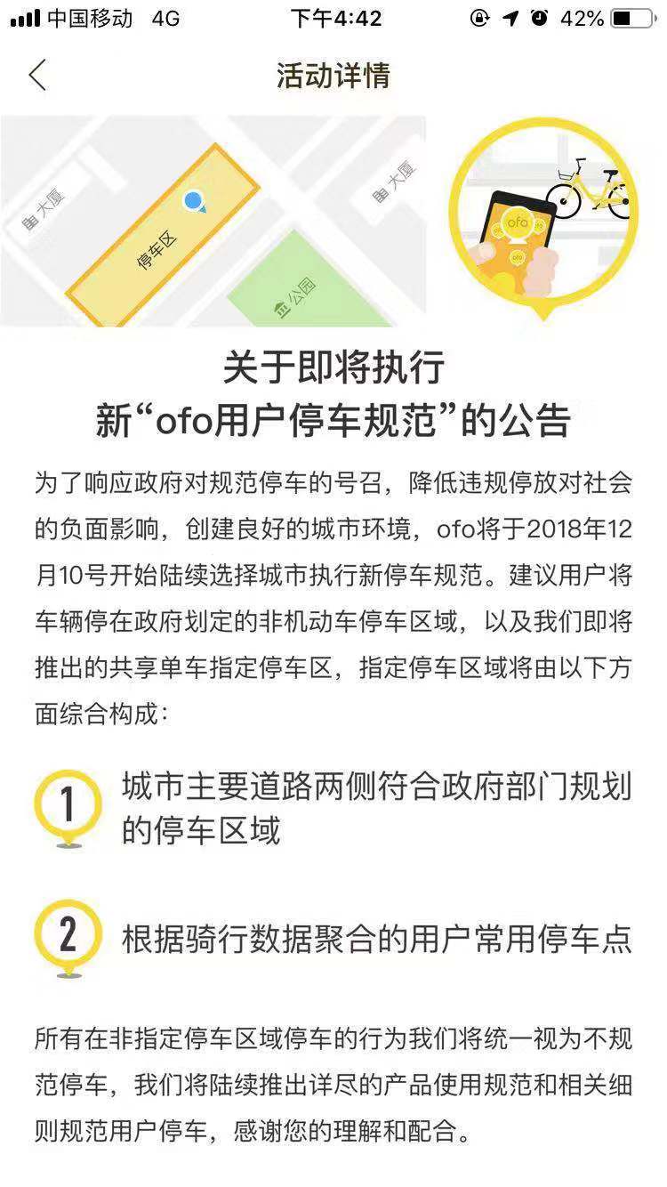 据ofo方面介绍,新版停车规范除政府规定禁停区域外,还将指定可停车区域,即在非指定区域停车的用户将被视为不规范停车。指定停车区域将由“城市主要道路两侧符合政府部门规划的停车区域”和“根据骑行数据聚合的用户常用停车点”两部分构成。届时,用户可在ofo app上查看带有标识的停车区,用户骑行结束后,如果在停车区内落锁停车,可正常结费。若在非指定区域停车,则会收到平台提示,具体规范细则将在近期随城市开放陆续公布。