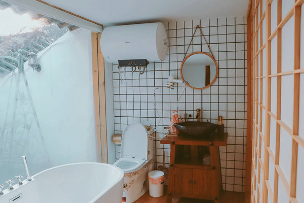 房间内配了一个白色大浴缸,与房间的色调搭配的相得益彰。点上香薰蜡烛,泡一个热水澡洗去一天的疲惫(免费浴盐),床上的被子面料是那种滑滑的,应该是真丝的吧,泡完澡再躺上松松软软的大床,简直不要太舒适~ 房间设计有点日式的味道,有推拉门将卫生间与房间隔开,窗户是那种苏式往外推的木质窗,很有feel。房内还有一个类似北方才会有的暖气片,抽屉内有防噪音耳塞、花茶、一次性擦脸巾等等,真的是非常贴心了!
