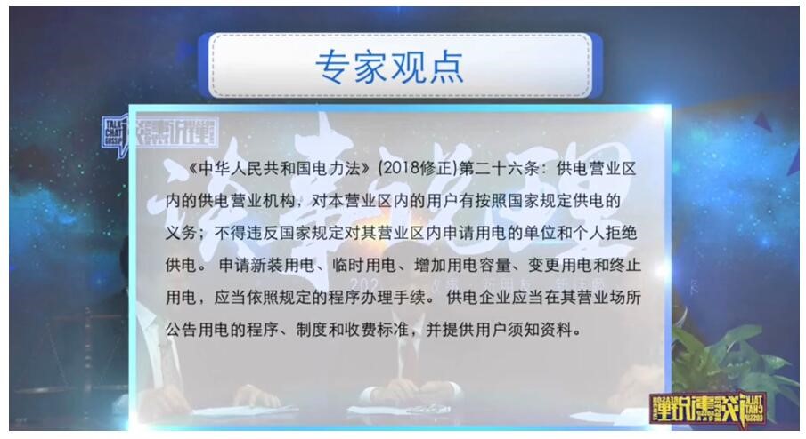 在专题节目中,北京林业大学教授杨朝霞发表观点:我们说二十几年来,他80%的电是他自己发电的,就是东莞市供电公司不给。这个来说是违法的。因为我们的《电力法》是明确规定的,就是电力公司、电力的供电机构是有给用户供电的强制的义务的。你不能拒绝供电,如果是拒绝供电,那么就是违法,正常供电就是你的强制义务。