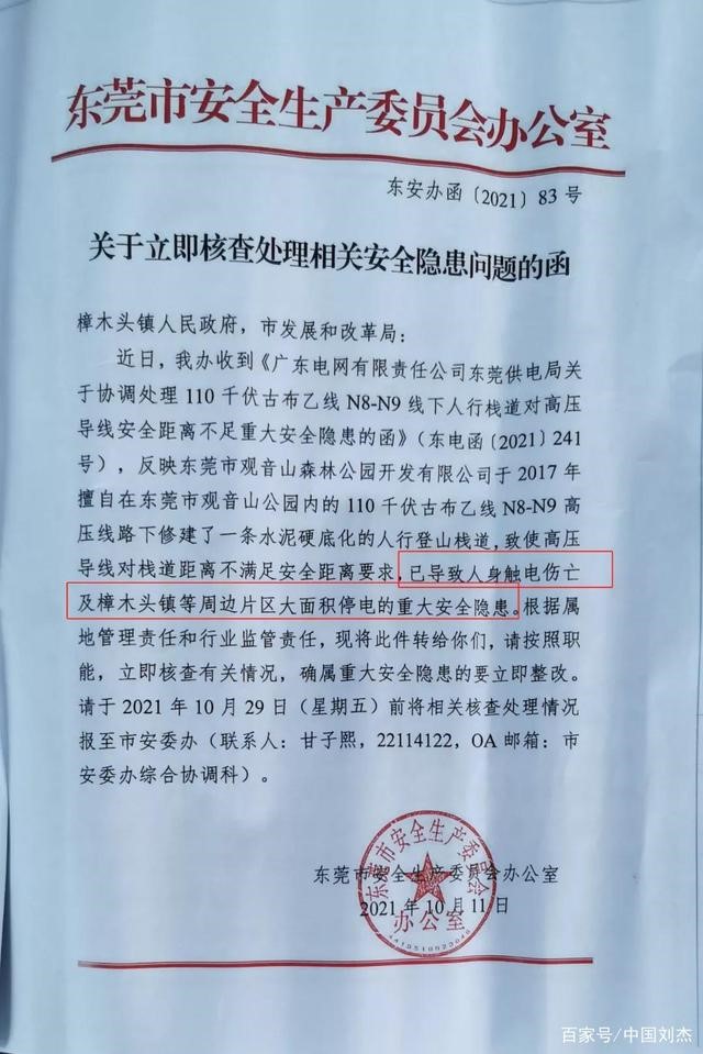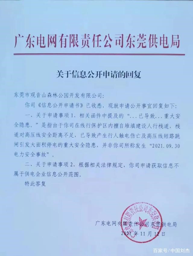 本应是一起简单的对山体塔方形成的倾斜电塔的塔基进行维护加固的公事,应该是供电部门的工作义务。结果,供电部门不仅直接拒收观音山方的信函,反而于10月11日向樟木头人民政府发函称:观音山公园不自行维护,在我局主动要求维护的情况下,还阻扰我局对影响杆塔安全的边坡进行维修。并称“观音山森林公园在线行保护区内擅自堆填建设人行栈道,并将其开放供人员活动的行为,已导致人身触电伤亡及樟木头镇等周边片区大面积停电的重大安全隐患。”