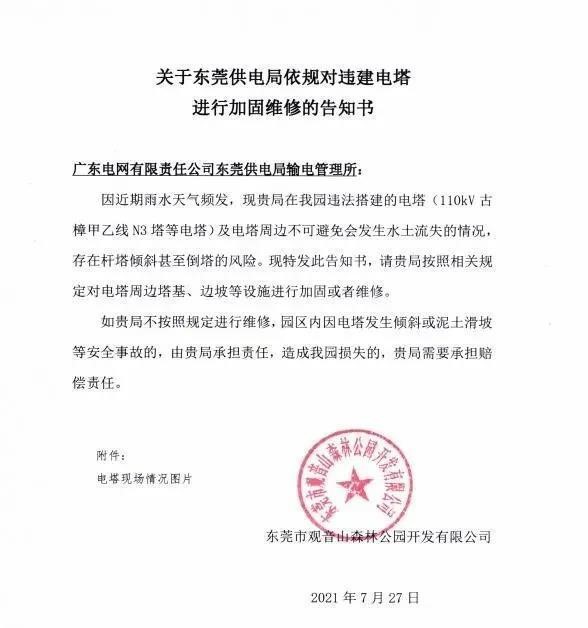 2021年7月27日,因雨水天气频发,加之观音山内的高压线的基座建设在坡地,受雨季水土流失影响的可能性很大,存在杆塔倾斜甚至倒塔的风险。这种现象实际发生后,观音山积极要求、发函敦促东莞供电局尽快依法依规进场按照相关规定对倾斜电塔周边塔基、边坡等设施进行加固或者维修。