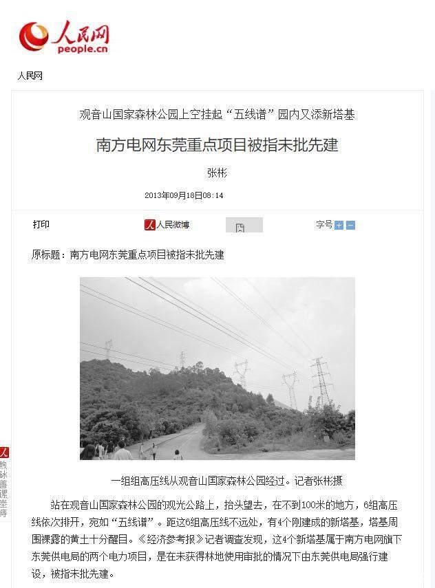 追溯起来,可以说早在2002年,广东电网公司东莞市供电局就在未经公园同意,也未向公园方提供国家林业、国土资源等部门关于同意在公园内架设高压线塔的批复文件,就擅自违法将多组高压线塔强行架设在观音山国家级森林公园内。