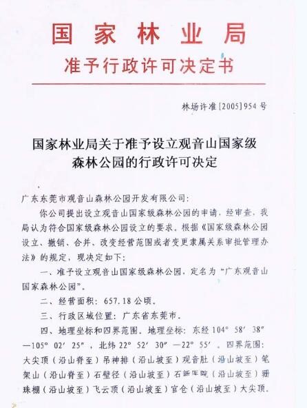 另外,在刘志庚东莞执政近八年时间,及他去省里任职期间,遭他迫害打压几欲抢夺而受伤害最严重的,也是东莞有目共睹的是一家民营企业、国家级森林公园,一个国家4A级旅游景区——观音山国家级森林公园。
