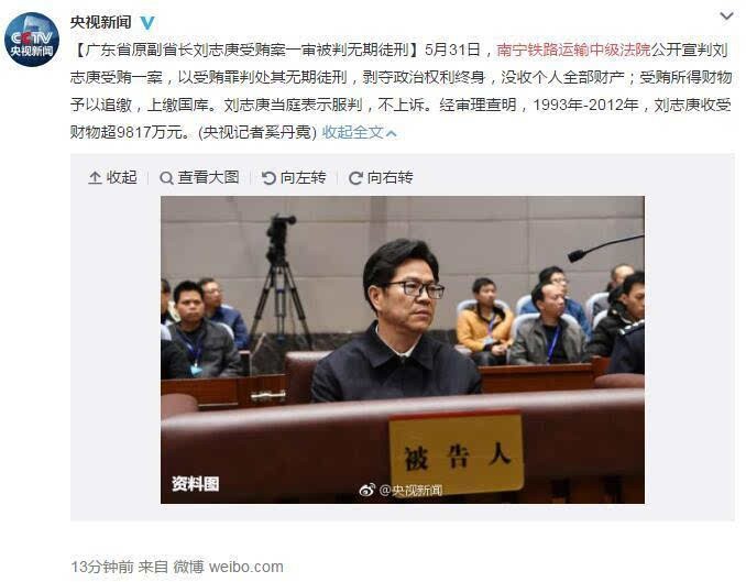 2017年5月31日,南宁铁路运输中级法院公开宣判广东省人民政府原副省长刘志庚受贿一案,对被告人刘志庚以受贿罪判处无期徒刑,剥夺政治权利终身,并处没收个人全部财产;受贿所得财物予以追缴,上缴国库。刘志庚当庭表示服判,不上诉。