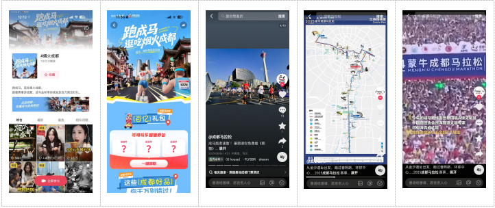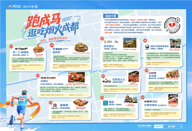 活动期间,抖音生活服务将特别联动成都马拉松金秋季打造“跑成马,逛吃烟火成都”系列活动。范围覆盖酒店、景区、餐饮等多个核心消费品类,针对马拉松期间的大众消费需求,提供专项折扣与组合优惠;同时还将打造多个站内逛吃热点玩法,帮助更多商家参与到赛事经济中。