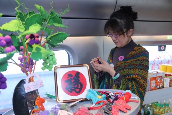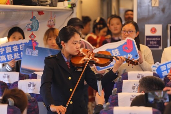 活动在欢快的舞蹈《你好我好新年好》中拉开序幕。随后,主题情景剧、萨克斯与小提琴独奏、宁夏“花儿”《走咧走咧去宁夏》、民乐合奏、快板串烧及三弦演奏等节目轮番上演,兼具艺术欣赏性与地方文化特色。车厢内还专门设置了非遗互动展演区,葫芦烙画、糖画、贺兰石篆刻及钩针编织等技艺在现场展示,吸引旅客互动交流。宁夏旅游投资集团也进行了专题推介,涵盖贺兰山东麓葡萄酒、贺兰山国家森林公园、六盘山红军长征景区等核心资源。