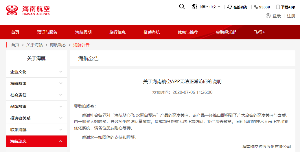 海航“随心飞”今日起售,APP访问量激增导致无法正常访问